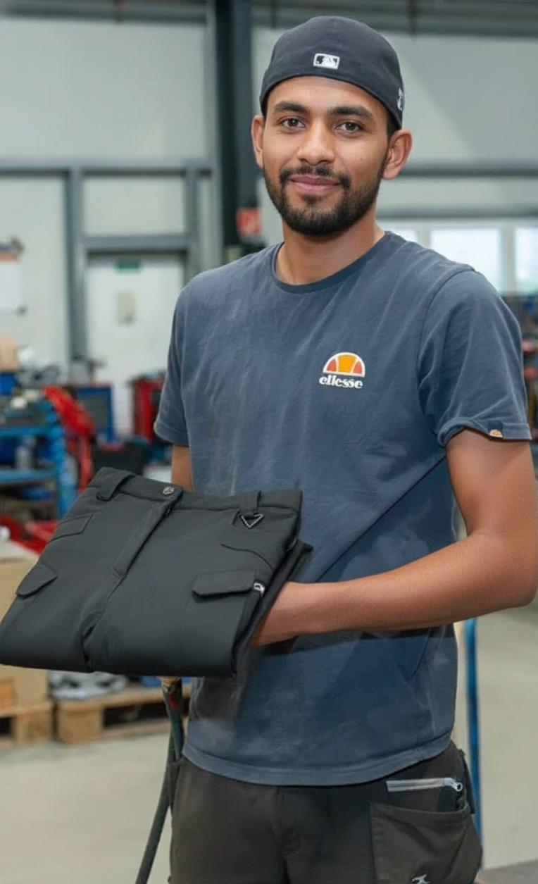 Estoy todo el día en el taller y constantemente en movimiento. Antes tenía pantalones pesados que nunca me quedaban bien. Con este nuevo pantalón es totalmente diferente: es ligero, cómodo y acompaña cada movimiento. Por la noche ya no siento tensión ni se me desliza nada. Para mi trabajo, es perfecto.